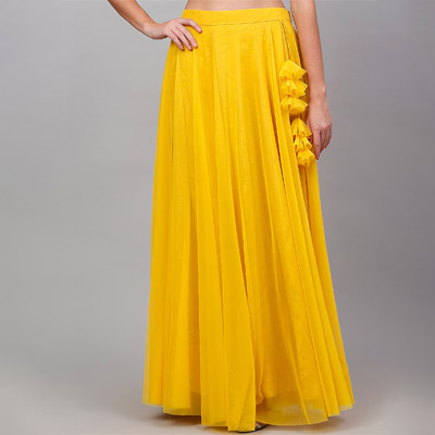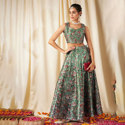 "Green woven design foil print flared skirt, has a zip and drawstring closure, and flared hem Size & Fit The model (height 5'8'') is wearing a size 28 Material & Care Poly Silk Dry-clean"
