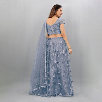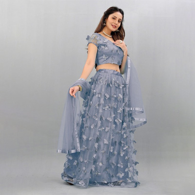 "Lehenga Fabric: Net Blouse Fabric : Net Dupatta Fabric : Net Lehenga Lining Fabric : Raw Silk Lehenga Closure : Drawstring Hemline : Flared Neck : Round Neck Sleeve Length : Short Sleeves"