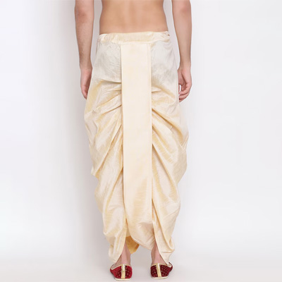 "Gold-Coloured solid traditional readymade dhoti, has a gold-coloured border with intricate embroidery detailing and drawstring closure Size & Fit The model (height 6') is wearing a size M Material & Care Silk-Blend Dry Clean preferably or cold light wash"