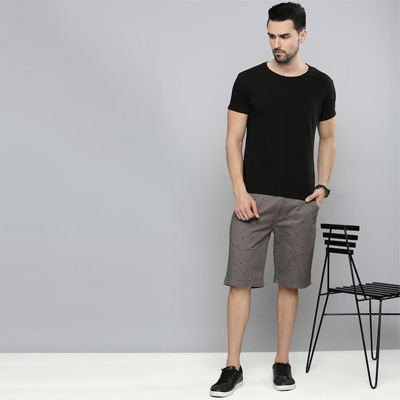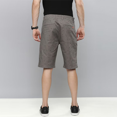 "Grey printed mid-rise regular shorts, has 4 pockets, button closure