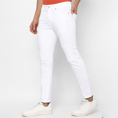 "Light shade, no fade jeans Slim fit, mid-rise Mildly distressed Non stretchable 5 pocket Length: cropped Size & Fit Fit: Slim Fit The model (height 6') is wearing a size 32 Material & Care 92% Cotton, 6% Polyester T400 and 2% Lycra Machine Wash"