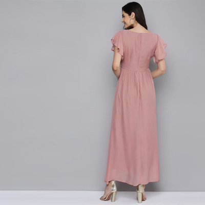 "Pink solid maxi dress V-neck Short, flared sleeve Maxi length in flared hem Zip closure Size & Fit The model (height 5'8) is wearing a size S Material & Care 100% Polyester Machine wash"