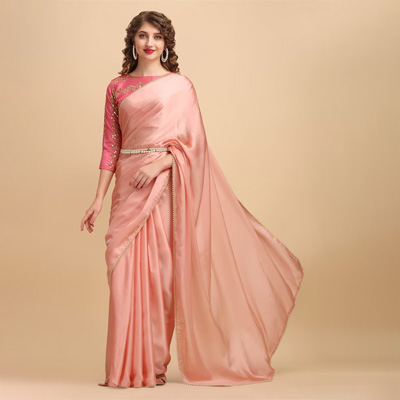 "Rose saree Solid saree with embellished border Has embroidered detail The saree comes with an unstitched blouse piece The blouse worn by the model might be for modelling purpose only. Check the image of the blouse piece to understand how the actual blouse piece looks like. Size & Fit Length: 5.5 metres plus 0.8 metre blouse piece Width: 1.06 metres (approx.) Material & Care Saree fabric: Satin Blouse fabric: Silk Cotton Dry Clean"