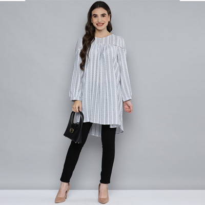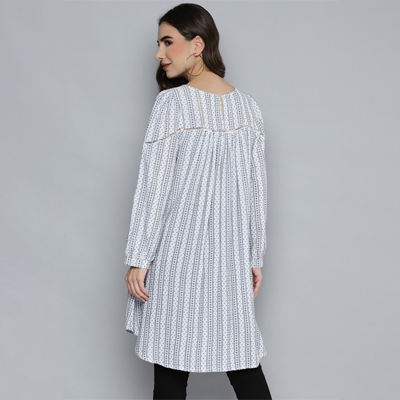 "White and navy blue self design tunic ,has a round neck, long sleeves, gathers detail, button closure Size & Fit The model (height 5'8) is wearing a size S Material & Care 100% Cotton Machine Wash"