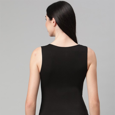 "Black solid thermal top, has no sleeves and scoop neck Material & Care 64% acrylic, 28% viscose and 8% elastane Machine wash"