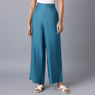 "Green knitted palazzos Solid Opaque Wide leg fit Length: regular Knitted polyester fabric Size & Fit Wide Leg fit The model (height 5'8) is wearing a size S Material & Care Material: Crepe Machine Wash"