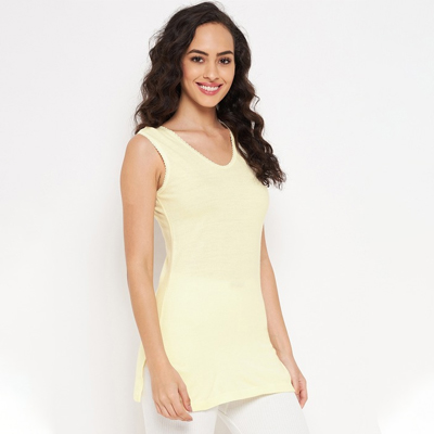 "Off-white thermal top, has a round neck, sleeveless with side slits Features: Made with two layers of fine combed cotton rich fabric for good heat retention Snug, tailored fit Elastane ribbed cuffs prevents riding up Blind reinforced seams Comfortable neck design Size & Fit The model (height 5'8"") is wearing a size XXS Material & Care Cotton Machine wash"