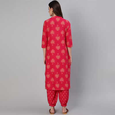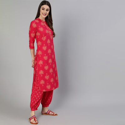 "Pink printed Kurti with Salwar Kurti design: Ethnic motifs printed Straight shape Regular style Mandarin collar, three-quarter regular sleeves Calf length with curved hem Pure cotton machine weave fabric Salwar design: Printed Salwar Partially elasticated waistband Slip-on closure Size & Fit The model (height 5'8) is wearing a size S Material & Care Pure Cotton Machine Wash"