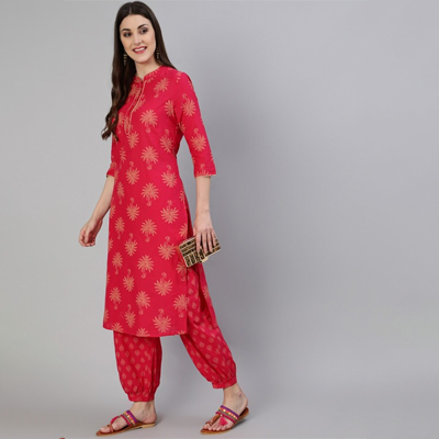 "Sleeve Length : Three-Quarter Sleeves Top Shape : Straight Top Type : Kurti Bottom Type : Salwar Top Pattern : Printed Top Design Styling : Regular Top Hemline : Curved Top Length : Calf Length"
