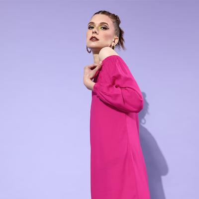 "Add a touch of class to your style with this sophisticated dress. This dress comes with a solid pattern and an off-shoulder design for an enhanced appeal. Pink shade Solid pattern Off-shoulder Long cuffed sleeves Viscose rayon, machine wash Trend Alert The 70s mini refers to apparel that is designed with a short length and feature details, like cutouts, bodycon, plunge necklines, tie-ups, knotted, halter necklines, and more that signify the 70s raves. Prints and patterns, such as colour-blocking, checks, psychedelic trails, florals, sunflowers, etc. further accentuate their appeal. Size & Fit The model (height 5'8) is wearing a size S Material & Care 100% rayon Machine Wash"
