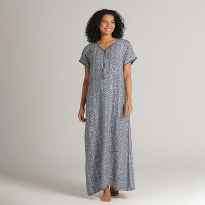 "This nightdress is crafted to redefine comfort. Its ultra-feminine look and feel is sure to appeal your unique taste. Features V-neck Short sleeves Maxi Size & Fit The model (height 5'8) is wearing a size XXL Material & Care Cotton Blend Machine Wash"