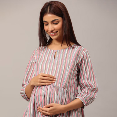 "Striped printed Anarkali shape Regular style Round neck, three-quarter puffed sleeves 1 pockets Above knee length with flared hem Pure cotton machine weave fabric Trousers design: Printed Trousers Drawstring closure Size & Fit The model (height 5'8) is wearing a size S Material & Care Kurta material: 100% cotton Trouser material: 100% cotton Machine wash"