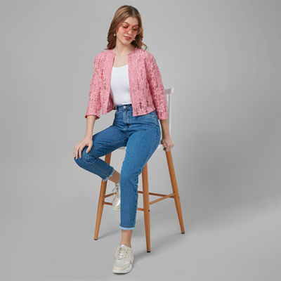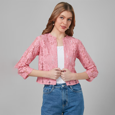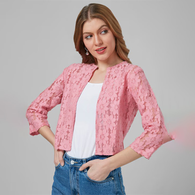 "Self design open front regular shrug ,has three-quarter sleeves, straight hem Size & Fit The model (height 5'8) is wearing a size S Material & Care Cotton Machine Wash"