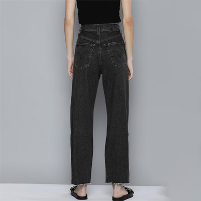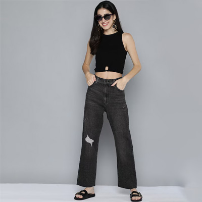 "Medium shade, light fade charcoal jeans Straight fit, high-rise Low distress Stretchable 5 pocket Length: regular Size & Fit Size worn by the model: 28 Waist: 24"" Hips: 34"" Height: 5'6"" Material & Care 99% Cotton, 1% Elastane, Machine-wash"