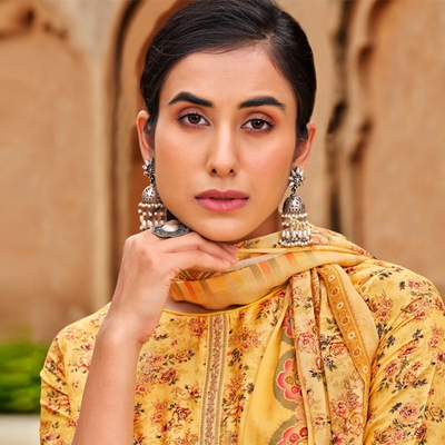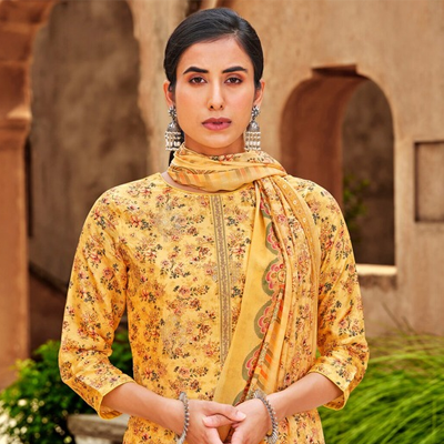 "Yellow and pink printed unstitched dress material Yellow and pink printed kurta fabric Yellow and pink solid bottom fabric Yellow and pink printed dupatta, has solid border Disclaimer: Images are for referral purposes only. The actual product is unstitched Size & Fit Top: 3 Mtr., Bottom: 2.90 Mtr., Dupatta: 2.25 Mtr. Material & Care Kurta & Bottom:Pure silk Dupatta:Chiffon Dry Clean Only"